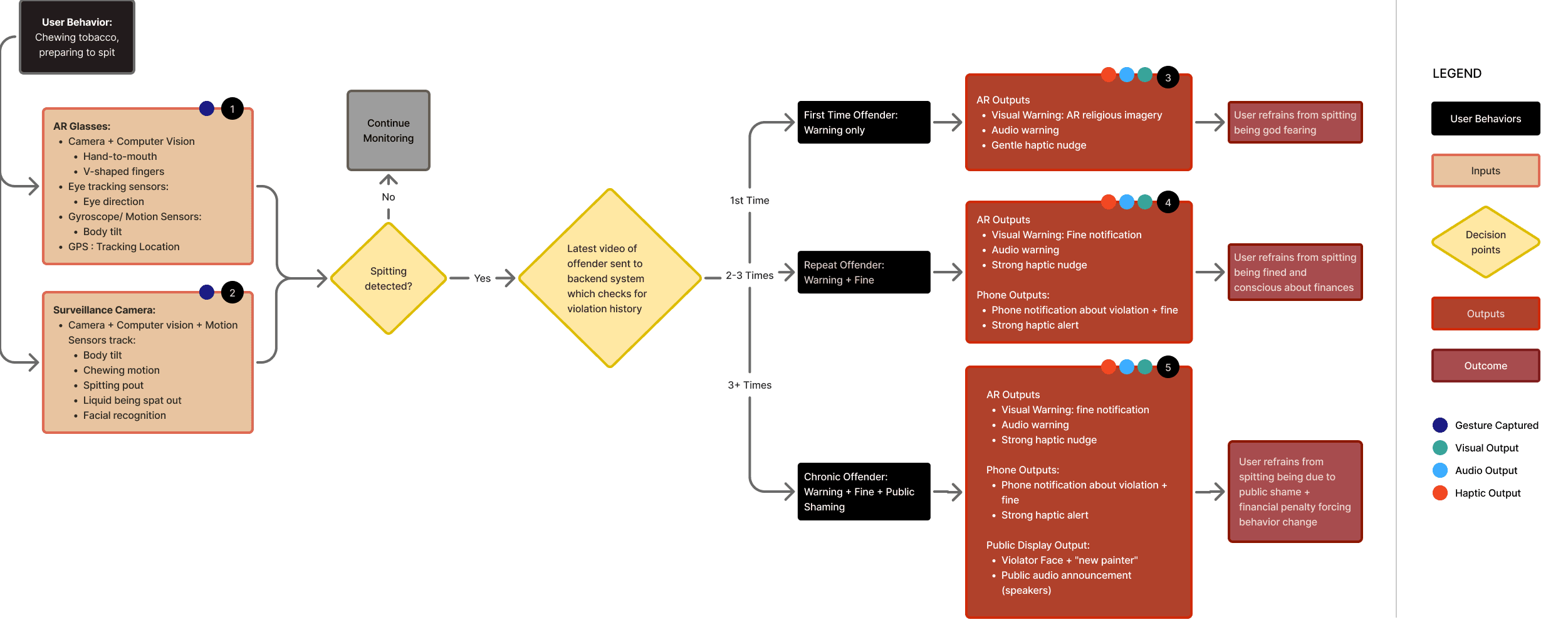To better understand the system, I created a system map outlining all the interactions within the user flow. The intervention functions through a complex network of sensors, computer vision algorithms, AR interfaces, and public displays, working together to detect, deter, and penalize spitting behavior.