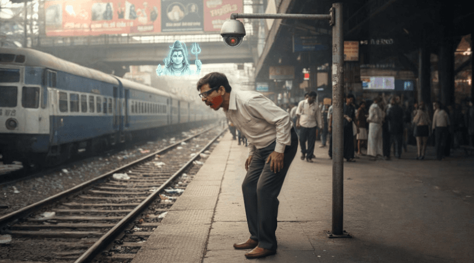 This is a speculative multimodal intervention designed to discourage spitting in urban public spaces in India, particularly chewing tobacco and betel nut spitting in public areas like railway stations.