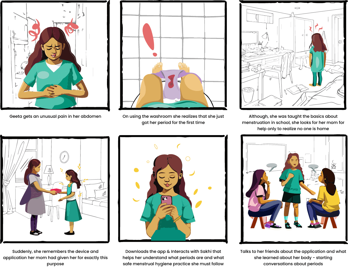 The Sakhi solution includes a screenless bracelet and app designed to raise menstrual awareness among rural Indian women. The bracelet, inspired by the Indian Bangle, tracks cycles with minimal input, while the app refines this data using machine learning, analyzes cycles, and allows data sharing with healthcare providers. An integrated AI chatbot provides guidance and answers user queries.