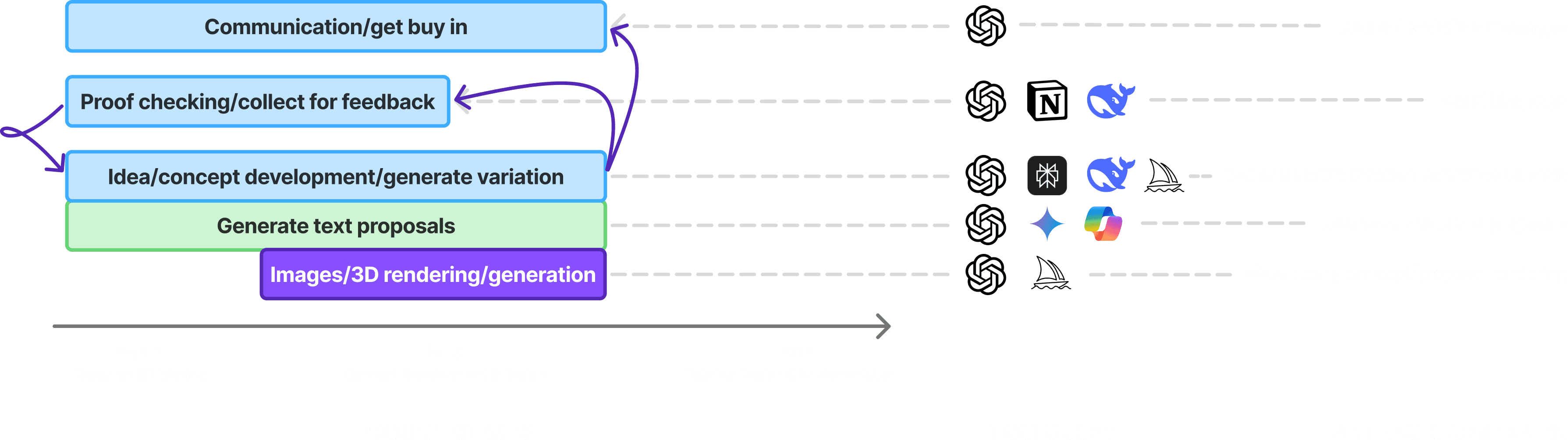 Tools are most valuable during research, visioning, and concept development for ideation and stakeholder buy-in, but see limited use in detailed implementation where precision is critical.