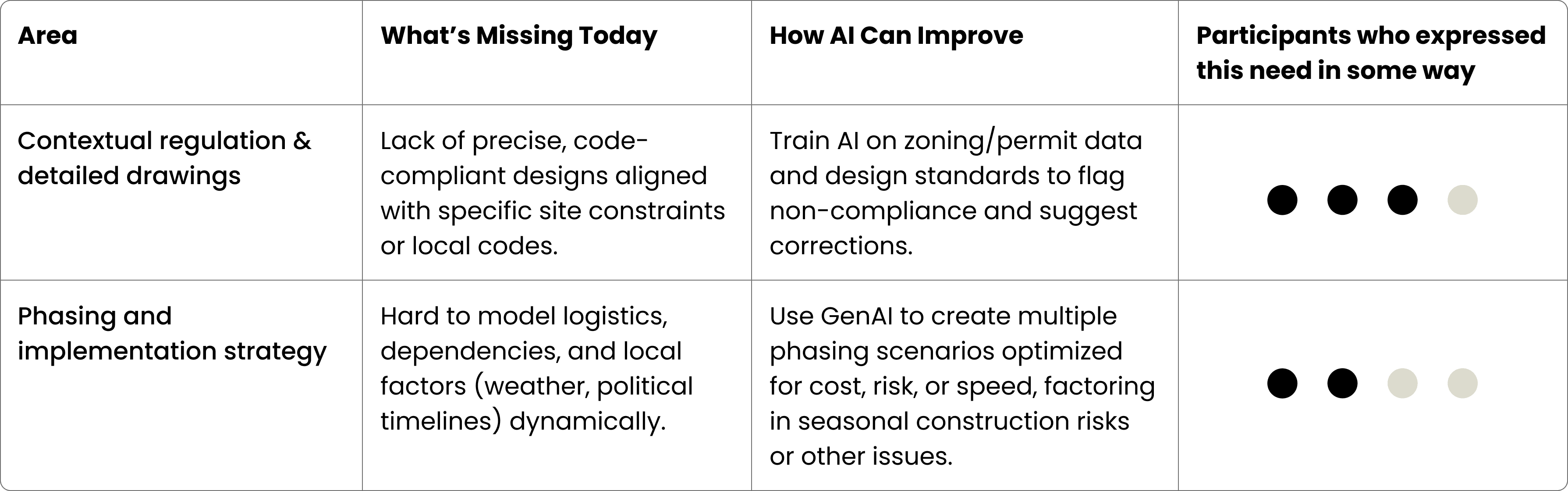 GenAI significantly accelerates workflows and helps build stakeholder alignment, but outputs consistently lack the detail and accuracy required for industry standards.